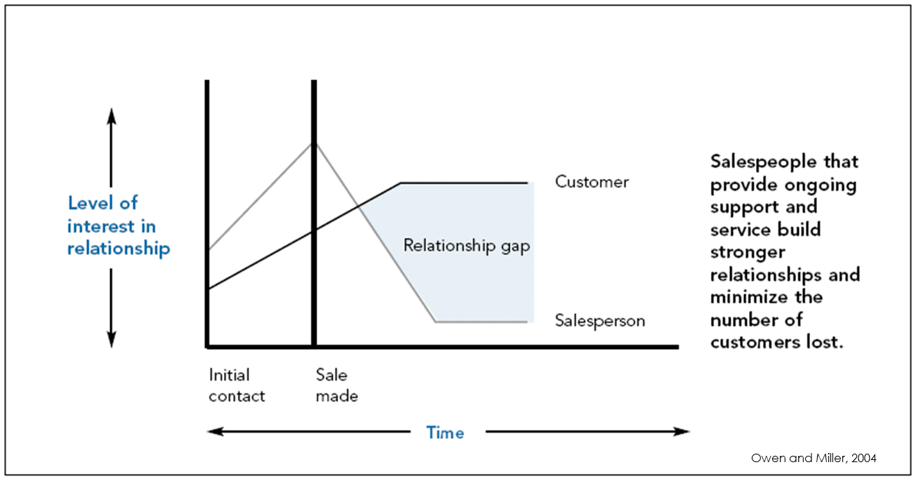 What occurs in a typical sales transaction is the sales associate invests time, energy and emotion into the pre-sale relationship. But once the customer “signs on the dotted line” the relationship ends for the sales associate, and he or she then focuses on the next sale. Interestingly, Owen and Miller (2004) found that the customer’s interest in the relationship actually increases after the sale. (“I can’t wait to show everyone that new jacket I bought.”) This creates a relationship gap: